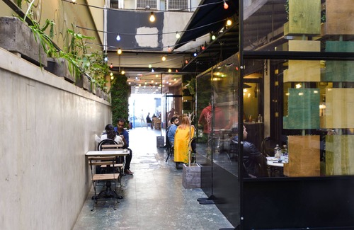 There is an elevator that will lead you to the top floor and everything like restaurants , shops ,ATM, banks , metro , tram are in front of of you!