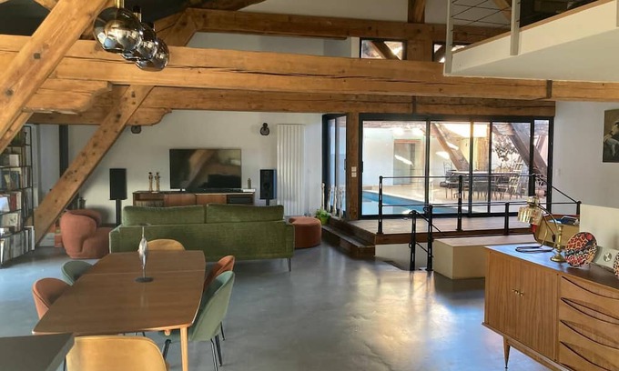 You will stay in an atypical loft of 240 m2, a few steps from the Saint Etienne Collegiate Church, the market square and the village activities. Tastefully furnished, it can accommodate up to 10 people. It has 3 comfortable bedrooms, each with its own bathroom, a fully equipped kitchen opening onto a large living room with a TV lounge and table football for games with family or friends. The mezzanine allows 4 additional beds with a desk, a fitness area and a relaxation area ideal for teenagers.