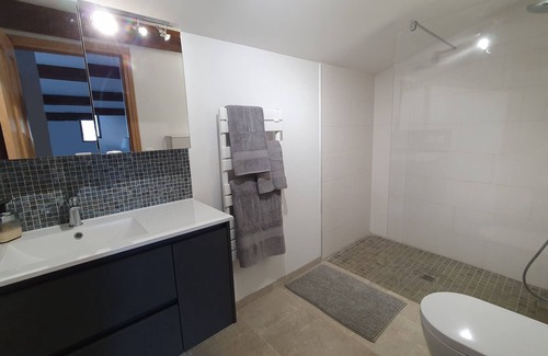 There is a walk-in wardrobe off the bedroom and a separate shower room with walk-in shower and heated towel rail, WC and vanity unit. A hairdryer is also provided.