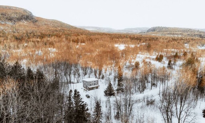 The cottage is secluded on the banks of the Mastigouche River and the surrounding mountains.