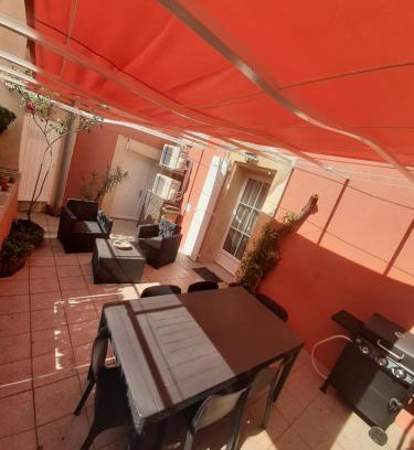 | Media & TechnologyFlat-screen TV, TV, Streaming service (like Netflix)GeneralHeating, Private entrance, Trash cans, Iron, Tile/Marble floor, Air conditioning, Smoke AlarmKitchenDishwasher, Cleaning products, Kitchenware, Kitchen, Wine glasses, Microwave, Washing machine, Dining table, Refrigerator, Oven, Electric kettle, Stovetop, Coffee machineLiving AreaDining area, Sofa, Sitting areaBathroomToilet paper, Guest bathroom, Toilet, Private bathroomOutdoorsOutdoor dining area, Barbecue, Patio, Terrace, Outdoor furnitureBedroomWardrobe or closetViewCity view, Inner courtyard viewAccessibilityUpper floors accessible by stairs onlyBuilding CharacteristicsPrivate apartment in buildingRoom AmenitiesDrying rack for clothing, Clothes rackFood & DrinkBottle of water |