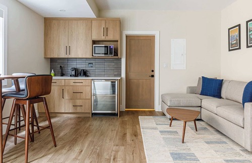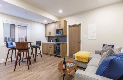 This ground floor suite sets the stage for privacy and relaxation, featuring a beautifully appointed queen bedroom with its own ensuite bathroom. There is additional sleeping for 1-2 guests on the sofa bed. A convenient kitchenette and a cozy living area with dining for four make this suite ideal for those seeking some solitude. The separate entrance adds an extra layer of privacy, ensuring you do not have to interact with guests staying in the main townhouse.