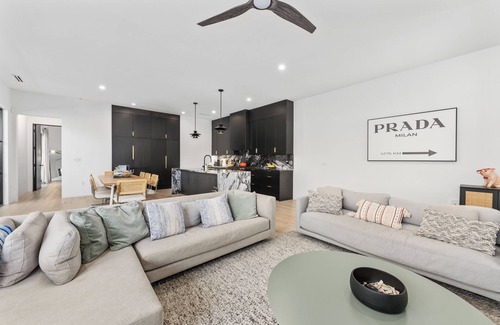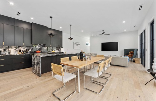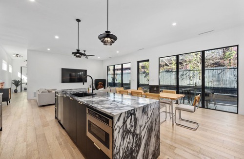 Welcome to Wander Austin Oasis, a modern retreat with high ceilings and an open floor plan. Enjoy the private outdoor pool and xeriscaped landscaping. The sleek kitchen features a central island and unique marble countertops, connecting seamlessly to the living spaces. The primary suite offers a luxurious en-suite bathroom with a soaking tub and walk-in shower, and a Four Seasons hotel-quality mattress for your ultimate comfort. Relax on the private patio and landscaped yard, combining style, comfort, and short distance to Austin’s best attractions.