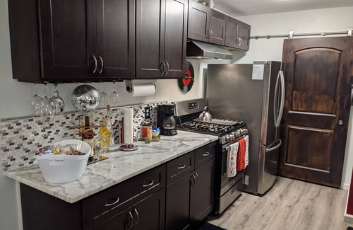 / modern updates. The entry to the town home community has 2 security gates. Enjoy the amenity of a fully-furnished kitchen with all stainless steel appliances, gas-stove, granite counter tops, beautiful cabinets. Kitchen is fully-equipped with dishes, pots, pans, cooking utensils, silverware, hand towels, paper towels, coffee, and some snacks. Also provided is clean drinking water from a 5 gal water dispenser.