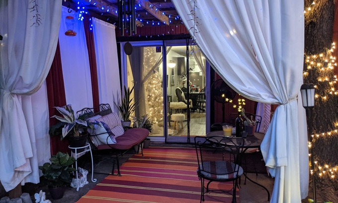 Get a great night's sleep in a comfortable, luxury, king size canopy bed with beautiful area rugs, and plenty of comfortable pillows. There is plenty of drawer space for your clothes, and other items, in a large wooden dresser set. You will have a hanging area for clothes & on into your bathroom with granite counter, new cabinets, sink,& large wall mirror. Relax in shower & tub along with your towels, toiletries .You will also discover a charming "resort-like" covered back patio furnished with bistro table set, decorative lighting, & a propane grill.