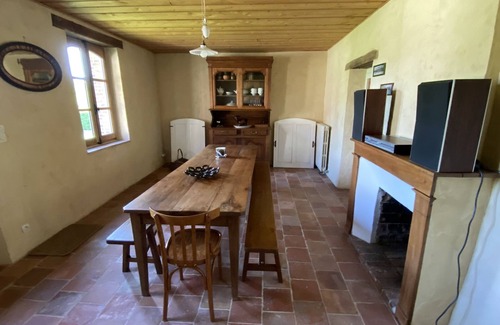 On the other side of the courtyard and the gravel path, the "Guest House" in stone and exposed beams with a large mezzanine bedroom (1 double bed and 2 single beds), a shower room, and a large cathedral room with its library, an office, and a magnificent fireplace. Two sofas (including 1 convertible into a double bed) form a pleasant living room with high ceilings.