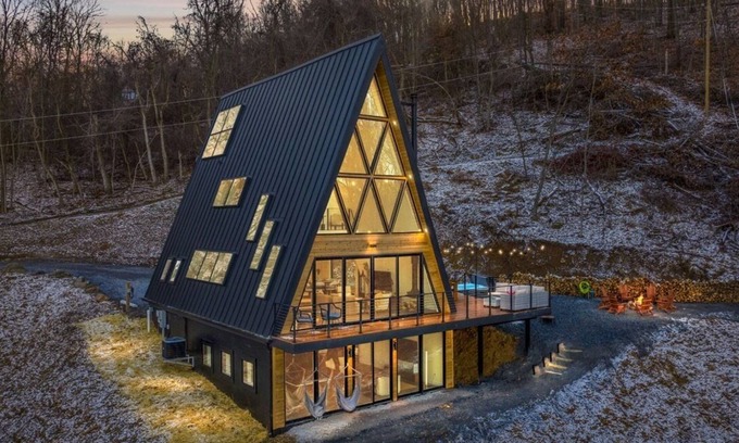 Welcome to Ava, a 4-story A-Frame marvel in the Shenandoah Valley. Discover hidden doors, a home theater, and a magical sliding island revealing the spiral staircase to the game room.