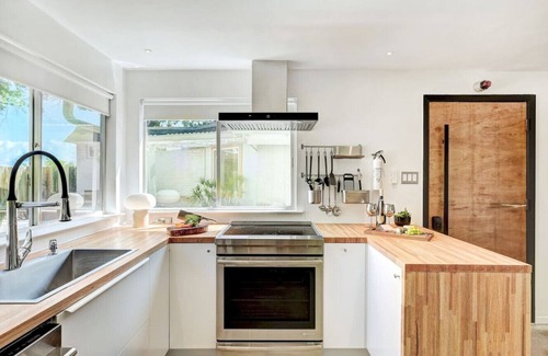 This 650 sq ft guest house features unique pilot-themed decor, premium appliances, and a mini chef-style kitchen. Enjoy blackout shades, a Morphy bed, and polished concrete floors with waterproof planks. Relax on your private patio and make use of the included washer and dryer. Just a 2-minute walk from Airpark of Lakeway and the golf course, it’s situated in one of the best neighborhoods in Texas. Perfect for both short- and long-term stays near the airport.