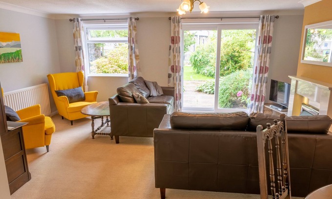 Inside: Fully-equipped kitchen including an induction hob and electric oven, dishwasher, washing machine, fridge/freezer, and microwave. Large living room with 2 two-seater sofas and two additional single chairs. Pato door leading to the front garden and patio area. Electric fire, flat-screen TV, Bluetooth speaker system and a DVD player are available as well as a bookcase with lots of walking books, maps, and local information. Dining area with a round table seating four, which can be extended to accommodate an additional 2 people. The hallway leading to the family bathroom, with shower over bath, basin, and loo + an airing cupboard. Double bedroom with bedside tables and wardrobe. Views to the mature rear garden. Twin bedrooms with bedside tables and wardrobes. Views also to the rear garden.Outside: Large enclosed mature gardens from the front to the rear of the property. Parking space to the front for 3 cars and gates to enclose the garden. Converted garage offers a table tennis table as well as newly fitted bolt anchors to secure bikes, should you bring them with. Rear south-facing garden with patio, outdoor furniture for six people, a fire pit and BBQ, ideal for watching over kids or simply to enjoy the sunshine. A complimentary bag of wood is provided for you.