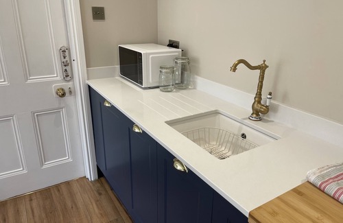 Enter through your own entrance (this is your space and not shared by us or other guests) into a spacious lobby area after accessing your keys via the key safe, come up the stairs and into the kitchen area which comprises quartz worktops, integrated sink and drainer, microwave oven, kettle, toaster and fridge. In the cupboards you'll find everything you need and everything a kitchen should have.