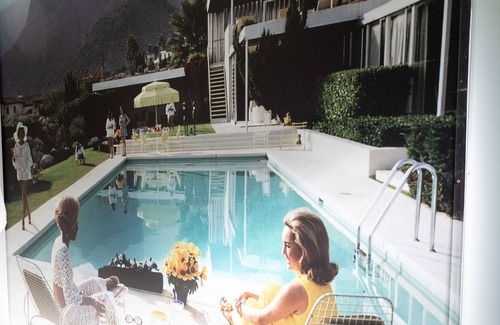 Palm Springs style bathroom with delightful artisan hand-painted cement tile floors (that show their age and patina) and a full tub and shower. The mural is a photo by Slim Aarons titled "Poolside Gossip". It is located in the back of the home near the three bedrooms.