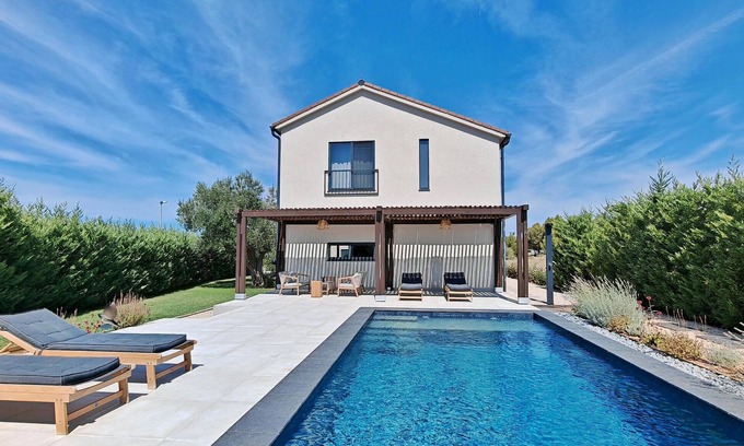 The villa was built in 2021 in a contemporary construction style, it offers its guests 206 m2 of living space and 1150 m2 of total property. The villa can accommodate up to 6 people comfortably in 3 bedrooms with double beds. The villa also has two bathrooms, one ensuite with a bathtub and a shower cabin, and one ordinary one that also has a bathtub and a shower cabin.