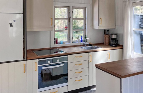 Your holiday home is nestled in a quiet, green wooded area and offers you a relaxing retreat with plenty of privacy. The charming architectural style and cosy ambience ensure feel-good moments. Make yourself comfortable in the bright living area. Browse through the well-stocked wall of books, relax on the sofa or watch a film. The room is cosily furnished with classic furniture and a wood-burning stove to keep you warm and cosy on chilly evenings. Cook together in the kitchen and enjoy your meals in the stylish dining area with a view of the greenery.