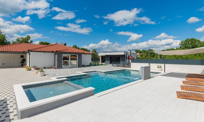 This comfortable, modern and beautifully furnished vacation home is located in the quiet and idyllic hinterland of Central Dalmatia, surrounded by greenery on a spacious, mostly fenced plot. Here you can feel comfortable and relax in the circle of your loved ones. Next to the beautiful vacation home there is an entertainment area with billiards, table tennis and table soccer, which should not miss your attention. In the yard there is a spacious heated swimming pool with a separate area for your children and right next to it there are several terraces and a covered terrace with a barbecue for cooking your favorite dishes. For the entertainment of children there are vending machines in the children's playground next to the house.