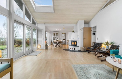 Your wonderfully situated holiday home impresses with its special location right on the water. As soon as you enter the house, you can see the glittering fjord panorama through the floor-to-ceiling windows. The interior of the house is flooded with light, has modern furnishings and an open-plan design. Make yourself comfortable in the spacious living area, enjoy the warmth of the fireplace and watch the waves play. The adjoining kitchen is generously equipped and combines functionality with style. The large dining table in front of the panoramic window is the ideal place to enjoy meals together.