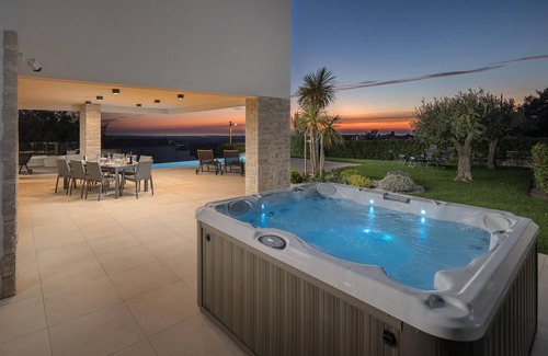 Enter this modern and bright house that promises you high quality and wonderful comfort. The house promises you a lot of space spread over three floors and offers you a great deal. Enjoy your time out from everyday life in the sauna or play darts or table tennis with your loved ones. Besides the sweet living inside, the terraces and the garden invite you to stay. Swim in the pool or relax in the jacuzzi and look over the countryside to the Adriatic Sea.