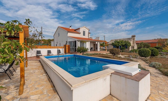 This comfortable vacation house is located in the small village Krkovic, not far from the town Vodice (about 15km). It consists of two bedrooms and a spacious living room, from where you can access the covered terrace and enjoy a view of the countryside. This vacation accommodation includes everything necessary for a pleasant vacation. On the enclosed property there is a swimming pool, a small traditional stone house where the barbecue is located, a children's swing, as well as a table tennis table. Visit the National Park Krka, the cultural towns of Sibenik and Vodice. The house owner also has CCZ036 on offer.