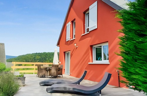 Spend your family vacation in this modern house with all comforts in Labaroche in the Regional Natural Park Ballons des Vosges. The colorful house is the perfect place to escape from your everyday life and enjoy the beautiful ambience. Here you will find yourself everything and can enjoy the view of nature from almost all rooms. Soak up the sun's rays on the terrace and take a dip in the heated pool, which is hidden from view.