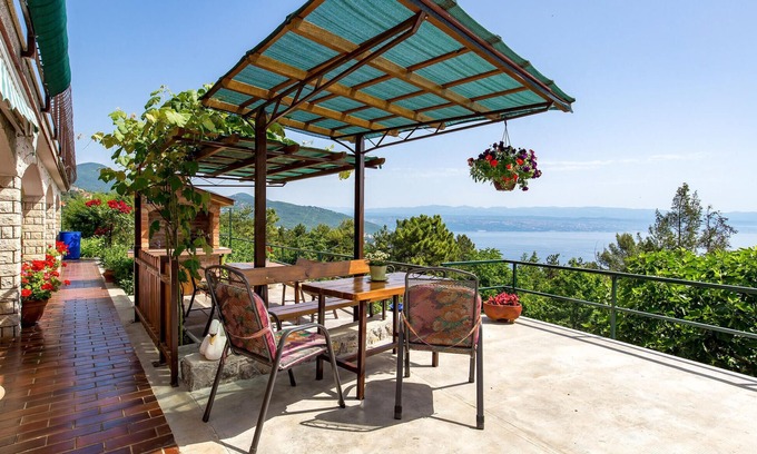 This cosy holiday home is located in the picturesque little village of Liganj, above Lovran, on the Uka hillsides. Relax in the quiet neighbourhood and enjoy the beautiful view of the sea and the rural surroundings from the balconies. The holiday home is located on a common plot, which is shared with the owner and the holiday properties CKO635, CKO636 and CKO925. Discover the Opatija Riviera, which is full of beautiful nature, parks, seafront promenades, beaches, bars and restaurants. Seasonal vegetables and fruits are available from the owner's garden. The barbecue is shared with CKO925. Away from the hustle and bustle of the city, you will enjoy the seclusion here to the full.
