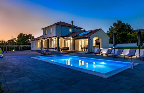This bright and modern as well as elegantly furnished vacation home with pool is located in Dubrava in the hinterland of Sibenik. Surrounded by nature and situated on a spacious plot, the house is perfect for a relaxing vacation with family or friends. The attic with two bedrooms and bathrooms is connected to the first floor by interior stairs. The covered terrace offers a nice barbecue. Here you can spend wonderful hours outdoors with your loved ones while enjoying a good meal. On the pool terrace you will find the perfect relaxation zone. Visit the beautiful and lively town of Sibenik, Krka National Park and the small town of Skradin.