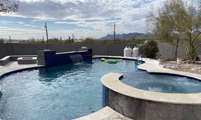 3 bedroom, 2 bath house with brand new in ground pool and hot tub with awesome views of the Superstition Mountains! So close you'll feel you can touch them.