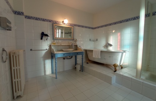 De grote badkamer is uitgerust met ligbad en douche, een wastafel, een toilet en een haardroger.