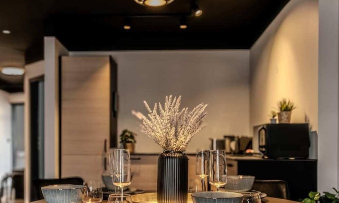 Our recently renovated two bedroom apartment features a chic, modern interior with stylish black and white decor, complemented by sleek wooden cabinets.