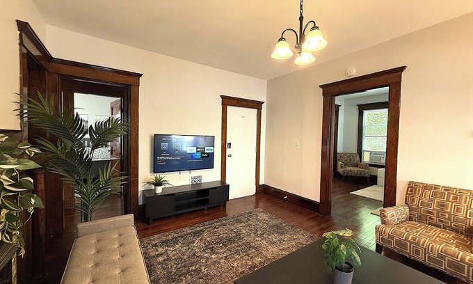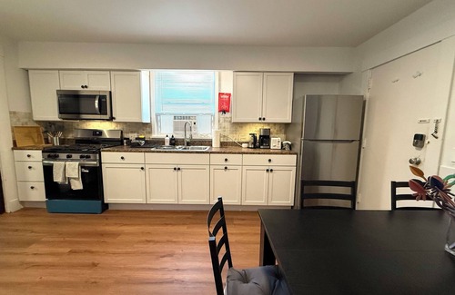 NEWLY RENOVATED - CLOSE TO ALL Beautiful, spacey, apartment with 3 LARGE BEDROOMS with a two queen and two twin beds and large closets. KITCHEN has lots of cabinets with dining Area, LIVING ROOM has very comfortable sofas ,50 “ smart Tv, Security cameras on common areas. QUIET NEIGHBORHOOD. Front porch, and easy parking .