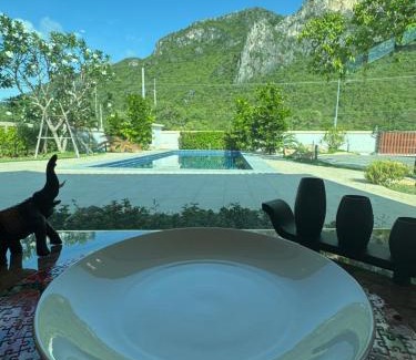 Offering a garden, Baan Sam Roi Yot Mountain View Pool Villa provides accommodations in Ban Hup Ta Khot. This property offers a private pool, free Wifi, and free private parking. Guests can use a terrace. Providing mountain views, this villa also provides guests with a flat-screen TV, a well-equipped kitchen with a microwave, a fridge, and a stovetop, as well as 3 bathrooms with a shower and a hair dryer. The property has an outdoor dining area. Hua Hin Airport is 34 miles away.