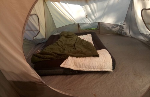 Large two bedroom tent and air mattress, outdoor shower available you can come inside to use our bathroom or we can let you use a hand made compost bucket system, Backyard fire pit, grill, picnic table, and seating available, along with rock wall for adventure. We are available to give you a taxi ride if needed. There is also a zipline available depending on whether or not someone is spending the night in the tree house.
