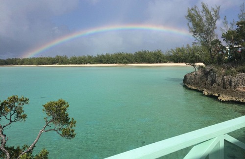The house is built to take advantage of its location on the water with bedrooms and living area facing the ocean. Each bedroom has its own full bathroom. The master bedroom has a king-size bed; the second bedroom has twins that can be converted to a king. Plenty of linens provided. While rates quoted are for 2 persons, this house works well for 2 couples because of the way it is laid out with bedrooms on each end and a common living area in the center. Additional charge is $15 per day per person, with a maximum of four total persons in the house. Bedrooms and living area open to the front deck and water. Each bedroom has its own covered sitting area that joins the front deck. For those who like to cook, the kitchen is well-furnished. Charcoal grill is located on back patio. Or, guests could elect to have a true Bahamian meal cooked for them at the house by contacting Sue Knowles; her number is posted at the house. Many local restaurants are within easy driving distance to the house. The property offers privacy. Serenity Cove home is tucked back in a cove and sits in the center of three lots, all owned by the property owner. Watch the night life on the water with the help of high-beam lighting that covers the cove area. Ten Bay Beach is one of the nicest beaches on Eleuthera; great for sunbathing, swimming, walking, and snorkeling right from the beach. Vacationers enjoy getting into the water in front of the house for swimming and snorkeling, or going to the beach which is a short 50 yards through the water. Many folks visit the entire island, but say their favorite place is right at Ten Bay Beach! A favorite past time is feeding fish from the deck. Serenity Cove offers one 2-person Gemini kayak and 2 single Perception Tribe kayaks with gear. The deck on this house is high and over coral rock. We always caution folks with small children. If you are an island visitor, you realize the tiny no-see-ums also love the area. We recommend that visitors who are sensitive, bring needed repellent. Water shoes are also recommended to avoid the sea urchins. The wrap-around deck offers you sun (or not) from 3 locations. Guests have explored this island from top to bottom and have found great beaches to explore. Many folks enjoy traveling south to Tarpum Bay to purchase fresh fish from the docks; wait until mid-afternoon. We recommend reading the guest book for ideas, and also entering your own for others to explore. Directions to the house: On Queens Highway, travel 14 miles south of Governor's Harbour airport; roughly 4 miles south of Palmetto Point. After your pass a small sub-station with transformers enclosed in a chain-link fence (on you right), the road to Ten Bay development will be on your right (about 1.5 or less miles). On right, look for sign that has property owners listed. Follow that road for about .8 mile; the house is on the right; palm trees lining drive to house.