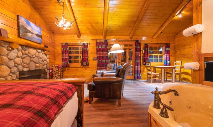 Baker Creek Mountain Resort's newly renovated Queen Cabin features a fully refreshed custom log and reclaimed wood interior with a kitchenette, and is the perfect space for a couple. The cabin features a jacuzzi tub, and the living area features a river rock wood burning fireplace. There is a custom made queen bed. A private deck with outdoor seating is also available for your perfect cabin life. Relax around one of our communal fire pits located on the banks of the beautiful Baker Creek.