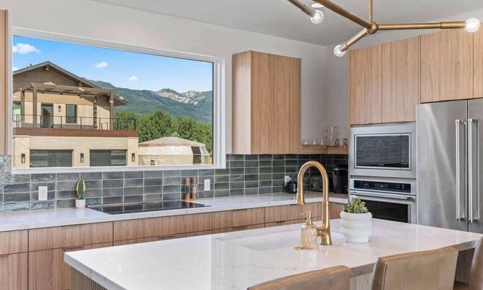 Enjoy a host of premium amenities, including a spacious observation deck with breathtaking views of Mount Timpanogos and the Wasatch Range, a cozy living area with a fireplace perfect for gathering and relaxing, a fully equipped kitchen with modern appliances and a dining area that seats everyone, high-speed WiFi, and 4 smart TVs for your entertainment. Outside, you can unwind by the outdoor fire pit or on the balcony, which is furnished with outdoor furniture and a grill, ideal for al fresco dining.