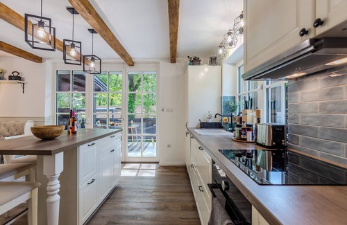 This modern-yet-rustic first-floor house features 2 cosy bedrooms and a small but welcoming entrance with storage space. The bright living room invites guests to unwind with comfortable sofas and a flat-screen TV. An open-plan kitchen includes an induction hob, a Nespresso coffee machine, an electric kettle, a microwave, an oven, a toaster, a dishwasher, and a fridge with freezer. Outside, a peaceful terrace surrounded by greenery features elegant dining—perfect for serene outdoor moments.