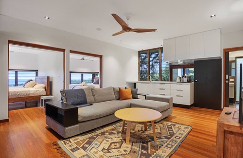 On the first floor you will find the open plan lounge, dining and kitchen that once again take in the views out to the Coral Sea. The covered deck becomes part of the living space and kitchen when opened and is the perfect entertainer. There are a further two bedrooms including the master and en-suite with another free standing bathtub.