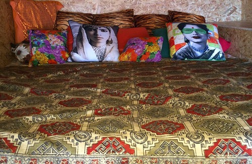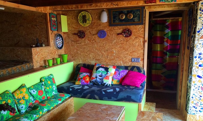 cozy and modern decor with original designs in bright colors and many works of art inside.