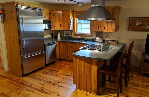 The main area of the cottage comprises the living room, dining room and fully-appointed kitchen. The gourmet kitchen is equipped with everything you will need including high-end professional appliances (fridge, stove, dishwasher and microwave) as well as a large array of cooking utensils, dishes, small appliances and much more. In addition, there is a washer/dryer should you need to do laundry during your stay and children’s items (including a pack-n-play and high chair) are also provided.