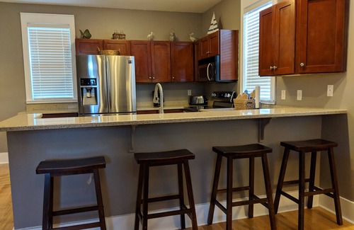 Stainless steel appliances (refrigerator w/ ice maker, range, dishwasher and microwave) in a fully appointed kitchen. Keurig coffee maker, large slot toaster, Hand Held Mixer and Blender provided as well. Dishes, cookware, baking pans and utensils provided to enable guests to prepare all meals within the cottage if they so desire.
