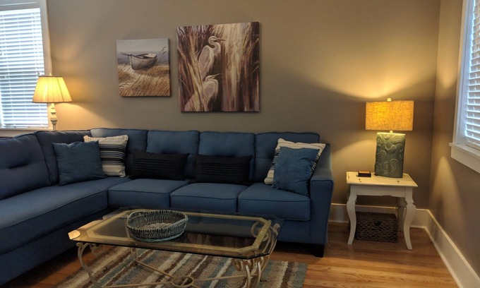 Bar seating accommodates four guests. Dining area will comfortably seat six guests .Half bath adjacent to the Living Room with Stacked Washer/Dryer along with Ironing Board / Iron provided for client use. Living Room has new Queen sleeper sofa as well as new 60' Smart Television. Master Bedroom has queen bed with full bath with glass enclosed shower. Second bedroom has queen bed with full bath w/ tub. Both Bedrooms have new 32 ' Smart Televisions. Cable provided as well as Internet with wireless router located within the cottage. Board games, cards, small library of books by current authors.