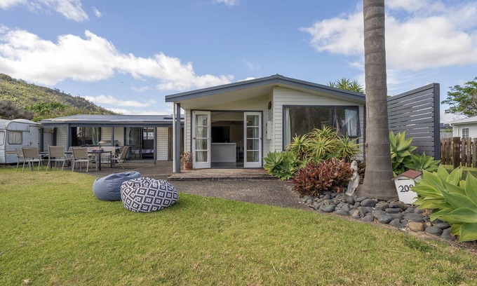 Indulge in the quintessential New Zealand holiday experience at this welcoming Matarangi bach. Kick into holiday mode as you step onto the expansive patio and onto the large, grassy lawn, where a game of backyard cricket awaits. The sun-drenched patio becomes your perfect summer hangout spot.