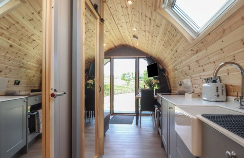 Barley, a single-storey pod, consists of an open-plan living space including a kitchen with oven, 2-ring induction hob, microwave, fridge with freezer compartment, and slimline dishwasher, a dining area, and a sitting area with sofa bed and Smart TV. The bedroom is a king-size, serviced by a shower room. WiFi, fuel, power, bed linen, and towels are included in the rent. Outside, there is a front decking, a non-enclosed side garden with patio and furniture, and off-road parking for one car. Please note that this is a pet-free and smoke-free home. Shop 2.7 miles, pub 0.2 miles, lake 0.3 miles, river 0.6 miles. Escape to the countryside in style with a stay at Barley. Note: Sofa bed sleeps an additional guest or can be used for flexible sleeping arrangements. Please note: bookings must start or end on a Friday or Monday only