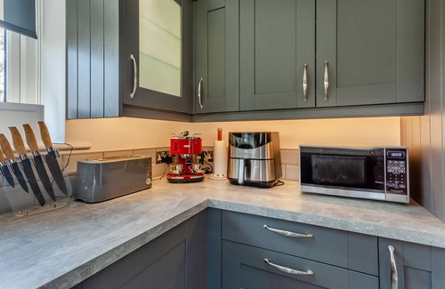 Electric oven/hob, fridge/freezer, microwave, air fryer, coffee machine, and washing machine