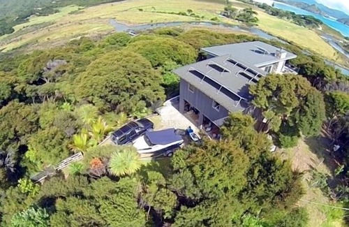 Has amazing, unobstructed North-facing 270 degree views over Medlands beach, bay and mountains beyond. Just a few minutes walk to spectacular Medlands beach via road or a bush track. The entire house is eco friendly with drinkable rain catchment water, solar panels providing all electrical power and solar water collector for hot water.