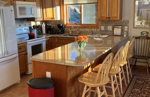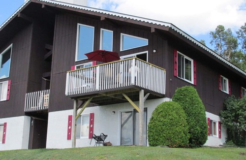 Our home is a 1 1/2 story condo advantageously located on a commanding mountainside site on Thorn Mountain with broad, spectacular views over mountains to the south, west and north. It has new warm and cool air conditioning throughout. Our home was beautifully designed as a 1 1/2 story upper condo unit comprising one of the four, quiet units in this chalet building.