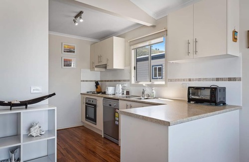 A stunning cabin with 2 bedrooms offering a balcony to sit, relax and soak in the views of the ocean which is only a short stroll away. Comprising an open plan design, the kitchen is fully equipped with everything you need to prepare your own meals during your stay, with cutlery/crockery, pots and pans, dishwasher, microwave, toaster, fridge/freezer, tea/coffee facilities. Guests are required to bring their own food to cook and enjoy. The living area is comfortable with a split system heating/ac unit and overlooks the balcony and has a television, DVD player and offers plenty of books and games for the family to enjoy. There are 2 bedrooms, the master has a queen bed and the second bedroom offers a tri bunk (double on bottom and single on top). There is a central bathroom servicing the bedrooms.