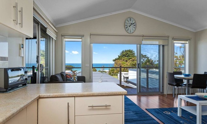 A beautiful cabin with ocean views set in a popular caravan park. Offering 2 bedrooms for up to 4 guests, this cabin provides a great place for family to enjoy a relaxing time close to the beach in Apollo Bay. With access to park facilities such as pool, adventure playground, communal bbq areas/fire pits, pump track, kids games room, wifi (500mb limit per day/speed restrictions).