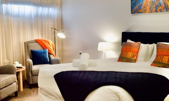 Suite 5 is a first floor room with private en-suite bathroom, Smart TV, bar fridge, Espresso machine, microwave, tea + coffee facilities, 1 x luxury super king size bed, a private en-suite, lounge chairs and free wifi. Our apartments are not located on the water, they are located in the St Helens township.