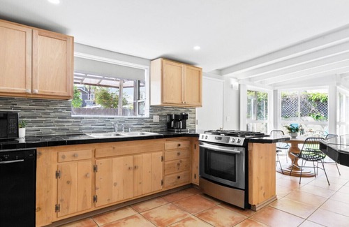 The bright, airy living room is a wonderful place to gather in this spacious home. Relax SoCal style on the sectional sofa and stream your favorite shows on the 65” flat screen Smart TV. The large open windows invite the most beautiful sunshine and make lounging in this room a highly enjoyable experience.
