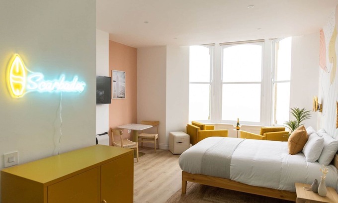 Wake up to stunning panoramic views of Scarborough’s South Bay from your private cabana with lounge seating. This stylish double room combines comfort with convenience in a peaceful seafront setting.