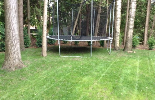 Outdoor firepit, patio area, basketball net and trampoline. Pets may be permitted upon approval of the owners. A $50 fee is required.
